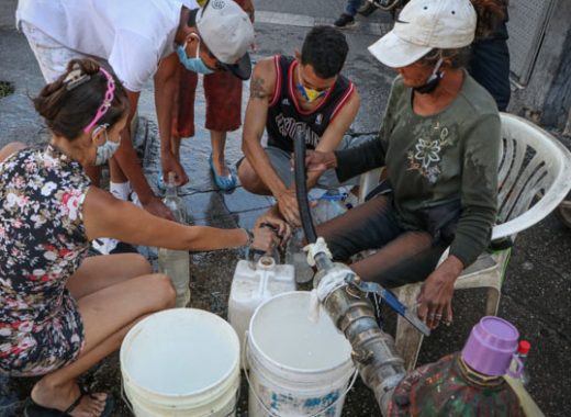 “A la deriva”. Así califican muchos esta situación que vive Venezuela en cuarentena. En San Martín (oeste de Caracas), vecinos recogen agua de un hidrante, otro de los servicios irregulares del país.