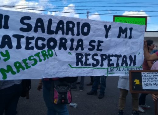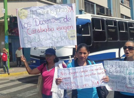 Un grupo de docentes estadales protestaron durante la mañana de este jueves entre las avenidas Cedeño y Bolívar de Valencia para exigir al gobierno regional que se dé la homologación salarial, respecto a los sueldos de los profesores dependientes del Ministerio de Educación, así como otros beneficios laborales.