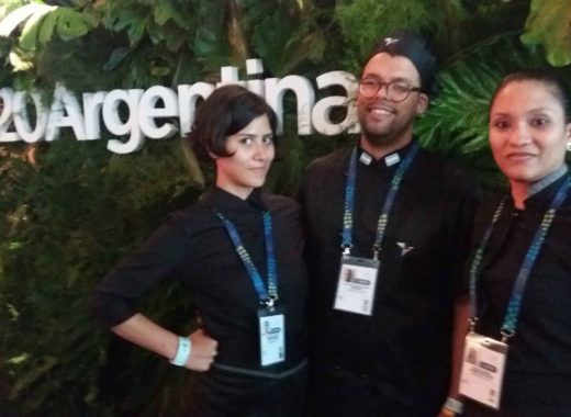 Los venezolanos Thalía, Rubén y Astrid forman parte de la cuadrilla de 70 mesoneros y 50 cocineros que prestan servicio a más de 2500 periodistas acreditados para cubrir la Cumbre del Grupo de los 20 (G20) en Buenos Aires, Argentina.