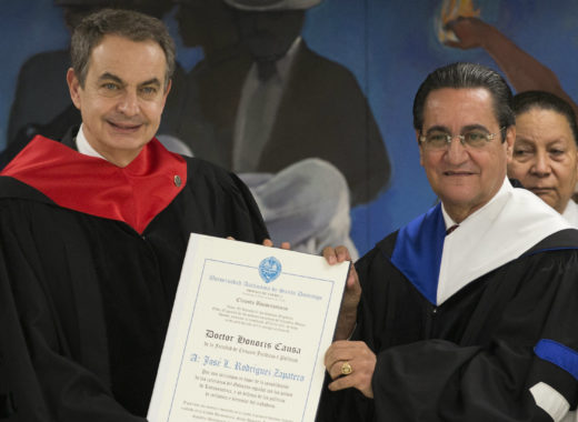 El expresidente del Gobierno español, José Luis Rodríguez Zapatero, manifestó este miércoles su optimismo sobre un "futuro en paz, en progreso y convivencia en Venezuela", tras ser investido doctor honoris causa por la Universidad Autónoma de Santo Domingo.Rodríguez Zapatero aseguró en su discurso tras recibir la distinción que mantiene una "visión positiva de la acción política" y que su "optimismo permanece y que incluso está optimista sobre el futuro en paz, en progreso y convivencia en Venezuela, tarea a la que ahora estoy muy empeñado".Posteriormente en declaraciones a la prensa, Rodríguez Zapatero, que ejerce de mediador para promover el diálogo entre el Gobierno del presidente Nicolás Maduro y la oposición venezolana, dijo que "el afán por la convivencia exige lucha por la convivencia, intentar generar confianza y mucho respeto"."Hay mucho antagonismo en Venezuela, pero nosotros la Unasur con los acompañantes estamos en un empeño decidido a que la senda de Venezuela no sea la de la confrontación, una confrontación que sería muy grave, sino que sea la senda del entendimiento", añadió.El presidente del Gobierno español recordó que el diálogo empezó en mayo y dijo que es un "proceso abierto", que no tiene una meta definida, sino que se trata de mantener "el espíritu de la capacidad de hablar, de mejorar el entendimiento"."Vamos a seguir en ese empeño, con el apoyo del Vaticano y de la Unasur, que ayer ratificó la apuesta por el diálogo en una reunión de cancilleres en Quito", aseguró.El pasado 26 de enero la oposición venezolana reunida en la Mesa de la Unidad Democrática (MUD) cerró el capítulo del diálogo con el Gobierno al negarse a seguir participando en estos encuentros bajo el formato en el que se desarrolló el año pasado y anunció que presentará un nuevo formato de conversaciones.El rector de la Universidad Autónoma de Santo Domingo, Ivan Grullón, dijo que al otorgar a Rodríguez Zapatero este honoris causa se tomó en cuenta que durante su gobierno (2004-2011) "desarrolló y ejecutó estrategias dirigidas al fortalecimiento y expansión de los derechos de la mujer".También destacó que el expresidente del Gobierno español "tuvo la visión de poner en marcha una política de inclusión y bienestar social para todos sus conciudadanos".Tras expresar su agradecimiento por esta distinción, Rodríguez Zapatero dijo que la defensa de los derechos de la mujer ha sido una referencia esencial a la hora de hacer políticas públicas durante su gobierno."La mayor discriminación que la historia conoce es la discriminación de las mujeres", afirmó.Rodríguez Zapatero también consideró que el dato más esperanzador para Latinoamérica es que dos terceras partes de los universitarios latinoamericanos son hoy la primera generación que acude a la Universidad.Para el expresidente del Gobierno español, la educación es "la mas poderosa palanca de cambio y progreso personal y social".