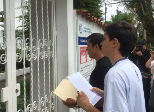 Un grupo de jóvenes perteneciente al Movimiento Estudiantil llegó hasta la sede del consulado de Colombia en San Cristóbal con el fin de protestar pacíficamente y consignar ante esa sede diplomática un escrito en el cual exhortan al gobierno del presidente del vecino país, Juan Manuel Santos, a pronunciarse ante los hechos generados en el país, luego de las sentencias del Tribunal Supremo de Justicia (TSJ) 155 y 156 que anulan el Poder Legislativo en Venezuela.