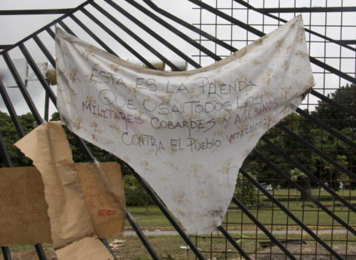 Entre lluvias intermitentes, gritos y consignas, ropa interior usada como pancartas de burla y hasta el esqueleto de un sofá, manifestantes de la oposición venezolana expresaron su repudio a la Fuerza Armada Nacional Bolivariana (FANB) frente a la base aérea Francisco de Miranda, en La Carlota, a propósito del reciente asesinato del manifestante David Vallenilla a manos de militares.