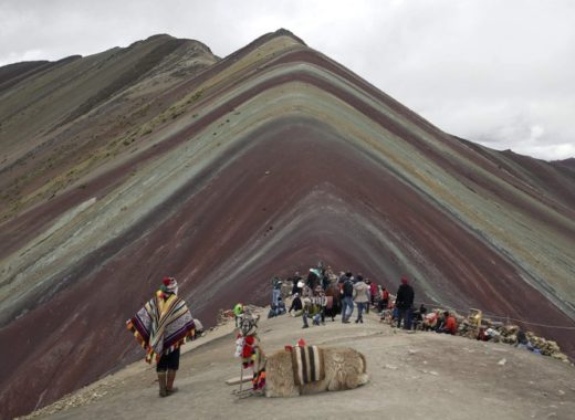 Los turistas respiran con esfuerzo mientras el oxígeno escasea en sus pulmones y continúan el ascenso rumbo a la remota Montaña de Colores. Después de dos horas de caminata llegan a una cima adyacente a más de 5.000 metros de altitud y se retratan con sus celulares junto a la rara belleza de la colina. Están muertos de cansancio, pero felices.