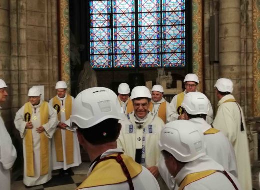 La catedral parisina de Notre Dame albergó este sábado, aun con andamios tras el incendio que devastó su cubierta, su primera misa, oficiada por el arzobispo de París, monseñor Michel Aupetit, con casco como el resto de asistentes.