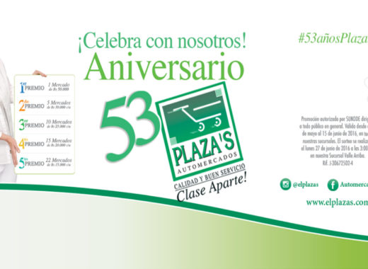 Automercados Plaza’s celebra 53 años de trabajo ofreciendo a sus clientes la oportunidad de optar por uno de los 53 mercados disponibles en la promoción aniversario.