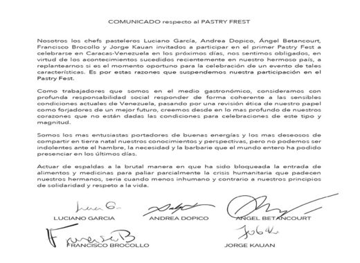Los chefs Andrea Dopico, Luciano García, Francisco Broccolo, Jorge Kauan y Ángel Betancourt, protagonistas internacionales del Pastry Chef, decidieron suspender su participación en el Pastry Chef como rechazo, por parte del gobierno, a alimentos y medicinas que serían utilizados como ayuda humanitaria.