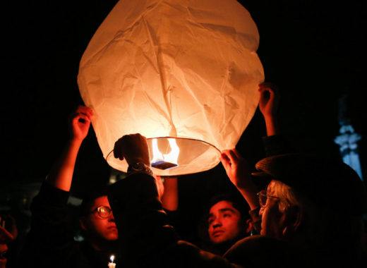 Decenas de globos de papel se elevaron en el cielo de Quito durante una vigilia en homenaje al equipo de periodistas del diario El Comercio, secuestrado y posteriormente asesinado en una zona cercana a la frontera de Ecuador y Colombia.