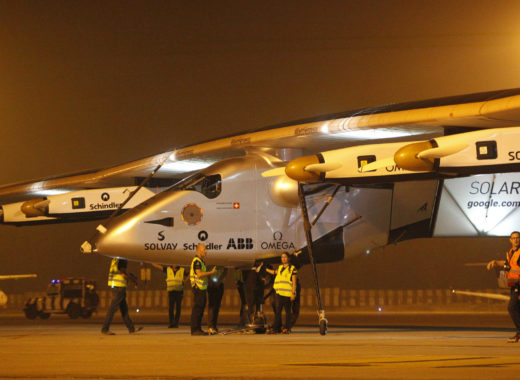 Está ocurriendo. Un avión propulsado únicamente por energía solar le da, en este momento, la vuelta al mundo