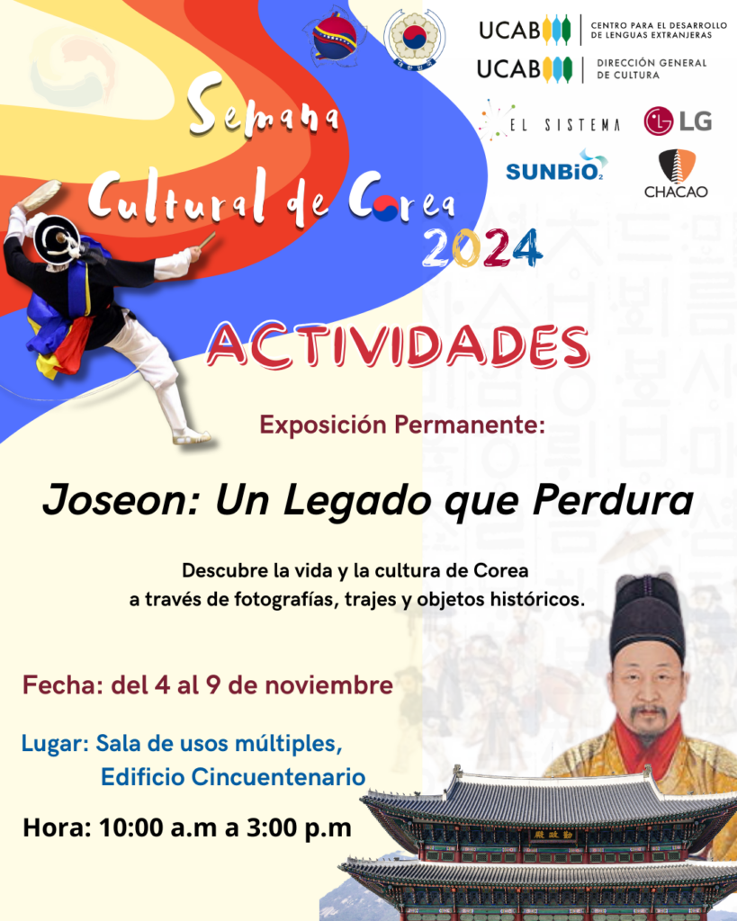 Gracias a una alianza establecida en 2021, la Universidad Católica Andrés Bello abre sus puertas para recibir esta celebración. Durante toda la semana, la Sala de Usos Múltiples del Edificio Cincuentenario, ubicada en la Planta Baja, albergará una exposición que sumergirá a los visitantes en el rico patrimonio cultural surcoreano.