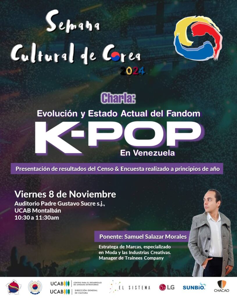 Del 4 al 9 de noviembre, la Universidad Católica Andrés Bello en Montalbán, se convertirá en el epicentro de la cultura coreana en Venezuela. La Academia Coreana de Venezuela, en colaboración con la Embajada de la República de Corea, presentan la Semana Cultural de Corea 2024. El acceso a las actividades será 100% gratuito