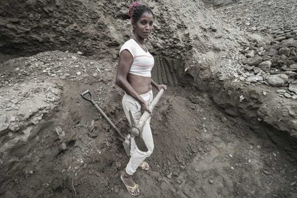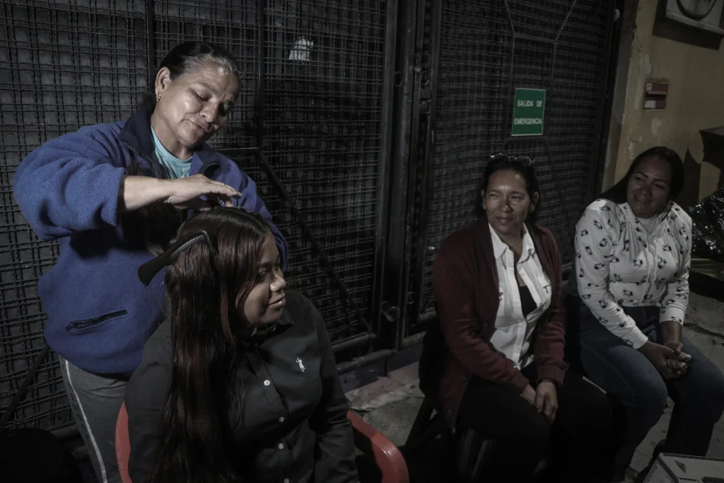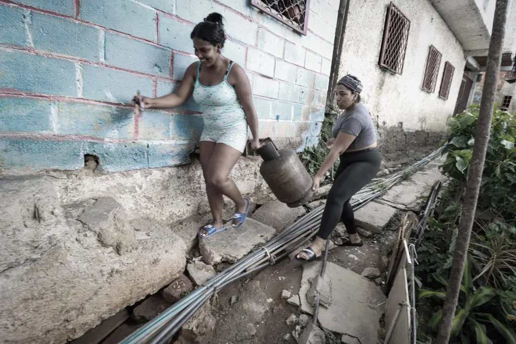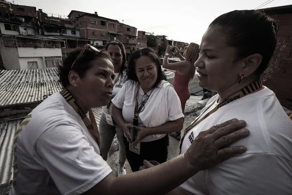 Una mujer vende globos en Sabana Grande, en Caracas, para ayudar económicamente a su hogarElena del barrio de San Isidro, que todos los días peina con delicadeza el cabello de su hija, porque es su forma de conectar.La reina de la mina, Misleidy Herrera, una mujer morena, delgada y fuerte de 36 años de edad. Misleidy aprendió a querer el trabajo duro. Pasa sus días en una cantera de piedra y arena en la zona industrial de San Isidro, Caucaguita.Vanessa Solórzano hizo de la calle la vitrina de su trabajo. Es vendedora de ropa en el boulevard de Sabana Grande. Las clientas confían en ella por su amabilidad y el acompañamiento que les brinda al momento de elegir una pieza que las haga sentir seguras de sí mismas. El trabajo de fomento cultural ha pasado por el cuidado estratégico de mujeres. La fiesta de San Juan, una de las más importantes del país, lleva la mirada y el trabajo de generaciones de mujeres líderes de los pueblos afrovenezolanos. Estas son las mujeres, niñas y adolescentes que han acompañado la fiesta en los últimos años en Barlovento, estado Miranda.Carmen Farfán es madre del preso político José Gregorio Reyes Farfán, detenido en la cárcel de Zona 7. Junto con otras mujeres familiares de presos políticos ha creado una red de apoyo emocional, físico y jurídico para continuar en la lucha por la libertad de sus seres queridos. Estar a las afueras de este penal desde principios de enero conlleva invertir tiempo y recursos -económicos- que no tienen, pero la solidaridad y el entendimiento ha prevalecido incluso en la distracción, como tejer el cabello de las más jóvenes. Ante la deficiencia de los servicios públicos, sobre todo del agua potable, una mujer de la comunidad de Catuche lleva en hombros botellones para su hogar.Dos mujeres de San Agustín cargan una bombona de gas doméstico, indispensable para cocinar. Son cuidadoras y trabajadoras domésticas sin remuneración que se ven obligadas a subir objetos de gran peso, como estos, por escaleras diariamente.Una maestra de aula de la escuela sostenible en Valencia maneja una serie de ecotécnicas, innovaciones tecnológicas y programas de sensibilización, diseñadas con la finalidad de preservar y restablecer el equilibrio entre la naturaleza y las necesidades humanas.Maestras de 15 escuelas de tareas dirigidas de Petare son las líderes del proyecto Catalinas Ilustradas. Cada centro educativo cuenta con una maestra. Algunas de ellas trabajan en escuelas públicas y otras ya están jubiladas. La mayoría consideró las tareas dirigidas una opción de emprendimiento debido a que su salario se ha devaluado y las condiciones de antes ya no existen. Aunque es un negocio, también es un acto de servicio que les sirve para fortalecer el aprendizaje de 512 niños que no reciben educación de calidad ante la deserción de educadores. Johanna González se dedica a la costura a pesar de tener años de experiencia en la psicopedagogía. Su sueño sería volver a vivir de lo que por años la llenó de satisfacción. Johanna comenzó vendiendo tapabocas, luego incorporó más productos: portacosméticos, cartucheras, tulas deportivas, bandoleros de diferentes colores, juegos de sábanas y cortinas sencillas. «Todo con material de calidad y al gusto de lo que el cliente necesite» Una comerciante informal de plátanos de Guatire ha encontrado la diversión en hacer fotos con su celular durante su jornada laboral. La doctora Gina González es la jefa del servicio de Urología del Hospital Domingo Luciani. Todos los años ella y su equipo de urólogos le prestan atención médica a cientos de hombres en los despistajes de cáncer de próstataElisa Vegas, directora de la orquesta Gran Mariscal de Ayacucho durante una presentación en San Agustín del Sur. Ella no solo ha dirigido los grandes musicales que se han producido en Venezuela, sino orquestas fuera del país. Deborah Emperatriz Briceño y Sofia Castillo con las voces más prometedoras del ámbito musical venezolano, forman parte de El Sistema de orquestas y han llevado cientos de conciertos entre tributos y recitales en el territorio nacional y en el exterior.