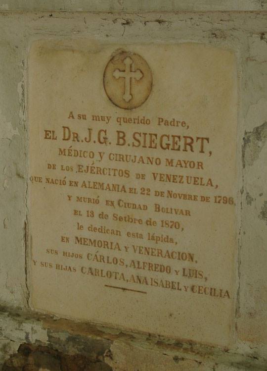 “El doctor Siegert fue un ilustre médico de nuestra guerra emancipadora, en la cual participó al lado del ejército patriota. Fue un hombre que realizó una gran labor como investigador, como demuestran sus estudios sobre la flora medicinal de nuestra tierra, así como la creación del Amargo de Angostura que le ha dado fama internacional y dentro de sus estudios cabe destacar aquellos sobre la glándula pituitaria, el cual le otorgó el Título Doctoral”.