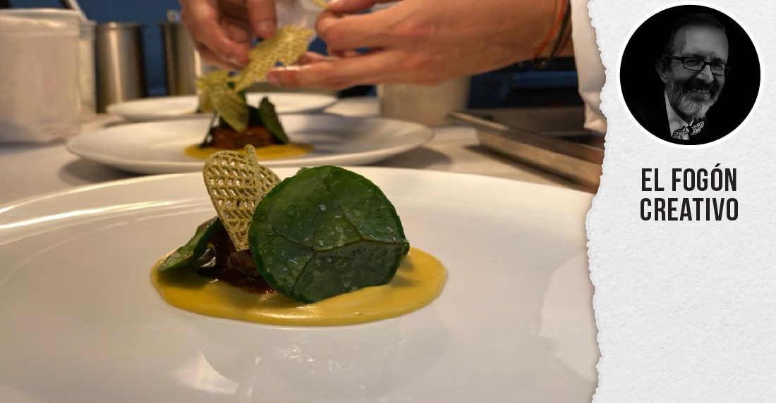 Completa la propuesta la espinaca española cruda marinada en aceite de oliva y limón junto con el crujiente de perejil. “Esto añade el sonido faltante, la textura que emociona” explica José Antonio. La muselina de plátano pintón les «parece ideal para redondear matices». Finalmente, emulan una gremolata pero con harina de maíz tostada «y así volvemos a la olleta más tradicional”.