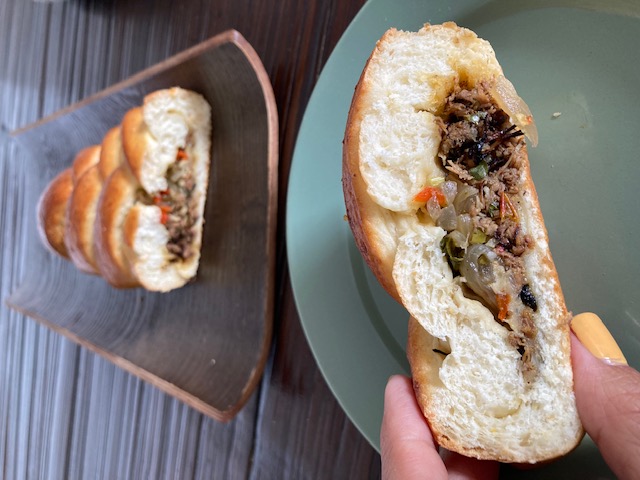 Son panes rellenos con carne mechada refrita, tostadita, queso gouda, mojito de cilantro y ají dulce, con aderezo de vinagre de jerez.