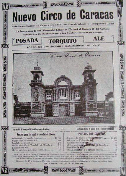 Ese domingo, en una tarde de sol, a las 4:30 fue inaugurado oficialmente el Nuevo Circo de Caracas con la actuación de los diestros Serafín Vigiola “Torquito” y Alejandro Sáez “Alé”. Los toros provenían de los potreros de Bucarito pertenecientes al general Juan Vicente Gómez.