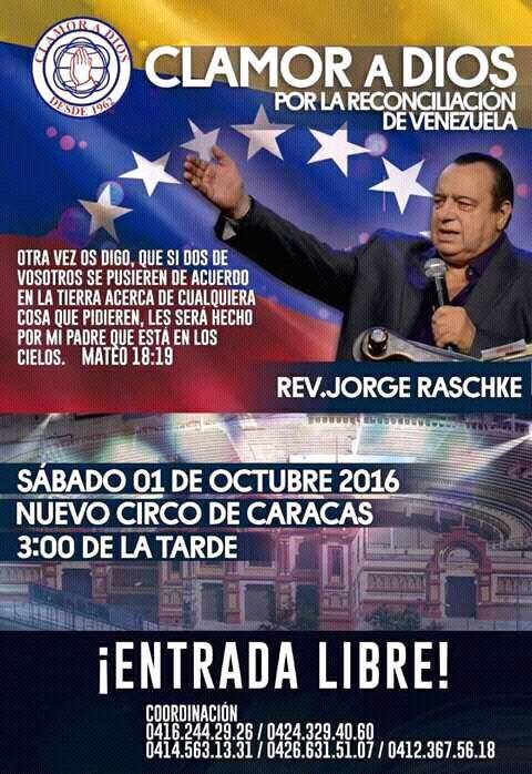 En agosto de 2010, Jorge Raschke, otro pastor pentecostal puertorriqueño regresó al Nuevo Circo. Cuenta Aquilino José Mata que Raschke aseguraba tener buenas relaciones con chavistas y opositores. El evento abrió las puertas del Nuevo Circo por primera vez, después de 15 años sin funcionar, para una actividad evangélica.