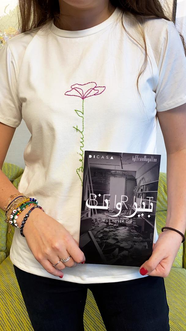 Una flor para Beirut es el resultado. Con su marca Di Casa y en alianza con el diseñador venezolano Efraín Mogollón, presentaron este proyecto de t-shirts solidarias, de 100 % algodón y bordadas a mano.