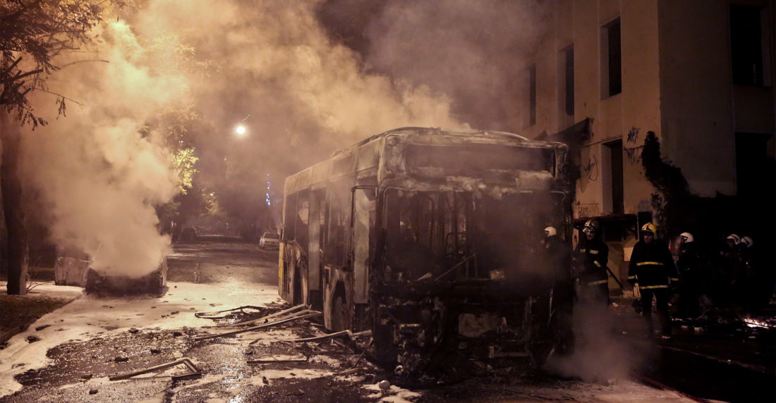 Tres coches y un autobús urbano (ocupado solo por el conductor que no resultó herido), además de varios contenedores, fueron quemados para levantar barricadas, mientras la Policía antidisturbios lanzó gases lacrimógenos y granadas aturdidoras.