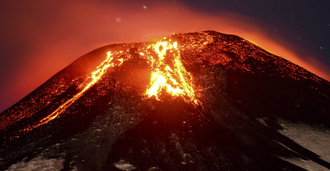 Después de semanas en que se había registrado un aumento de su actividad, el volcán despertó cerca de las 3 am, lanzando luminosas columnas de lava que en el momento de máxima intensidad alcanzaron los ocho kilómetros de extensión.