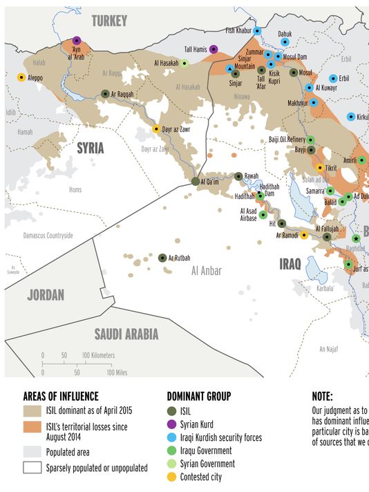 El beige claro son las áreas que domina el Estado Islámico. El marrón claro son las pérdidas territoriales del EI.
