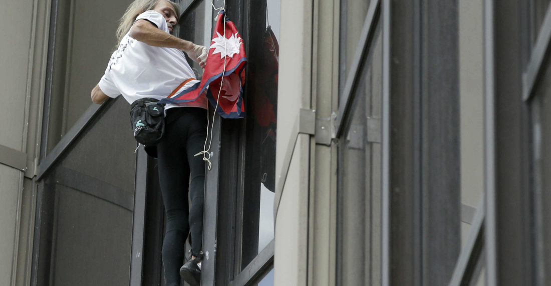 Durante la ascensión intentó colgar una bandera de Nepal y banderas de oración multicolor en la torre, pero se volaron rápidamente.