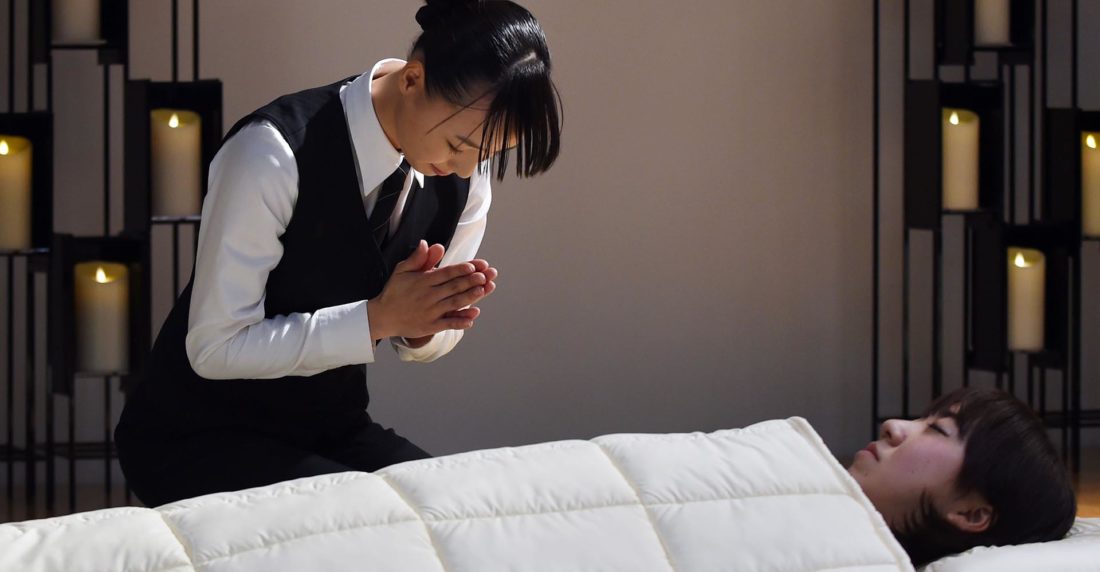 En Japón asear y arreglar a los cadáveres es todo un arte. Sayuri Takahashi se arrodilla con gracia junto a una mujer inmóvil, le toma un brazo, luego otro, las piernas … y la viste a la luz de velas artificiales.