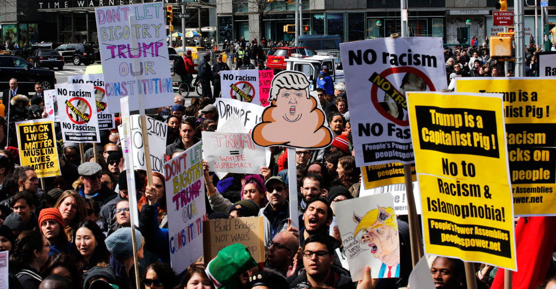 «Expulsen a Trump», «construyan un muro alrededor de Trump», se leía en las pancartas de los manifestantes de las más diversas edades. «No dejen que la intolerancia se imponga a nuestra constitución», decía otra, así como «Cambio a Donald Trump por 25.000 refugiados».