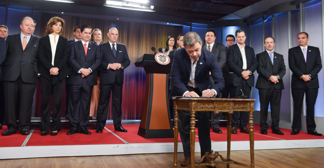 Flanqueado por ministros y legisladores, el presidente Juan Manuel Santos firmó este martes el decreto que cita a los colombianos a pronunciarse sobre el acuerdo alcanzado la semana pasada en La Habana con las Fuerzas Armadas Revolucionarias de Colombia (FARC, marxistas), al que se oponen sectores de derecha.