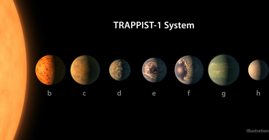 A 39 años luz de la tierra,  alrededor de una estrella conocida como Trappist-1, y catalogada por la NASA con el nombre 2MASS J23062928-0502285, giran siete exoplanetas, con tamaños similares a los de nuestro «pequeño punto azul pálido», como llamara Carl Sagan al planeta tierra.