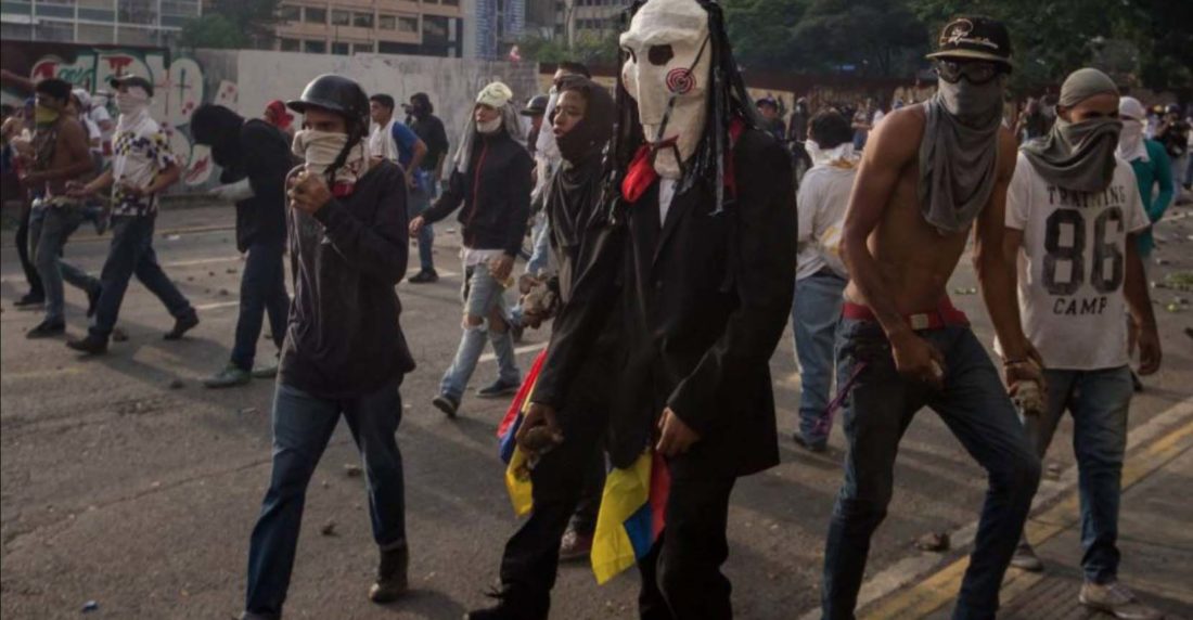 La imagen que acompaña la publicación muestra a un grupo de jóvenes, algunos encapuchados y otros con máscaras, portando armas de fuego durante una protesta en la ciudad de Caracas.