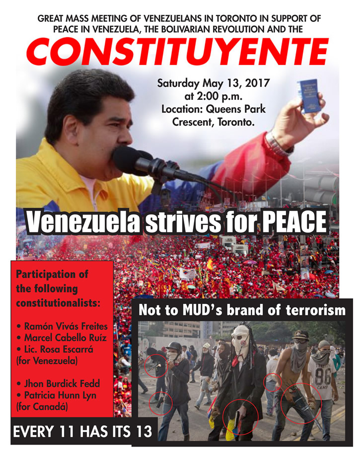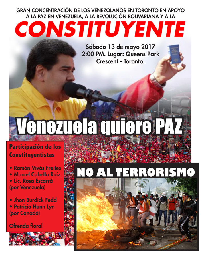 El Consulado de Venezuela en Toronto convocó a los ciudadanos a reunirse el próximo sábado 13 de mayo en una «gran concentración» en la ciudad canadiense en apoyo a la paz, a la revolución bolivariana y a la Constituyente anunciada por el presidente Nicolás Maduro.