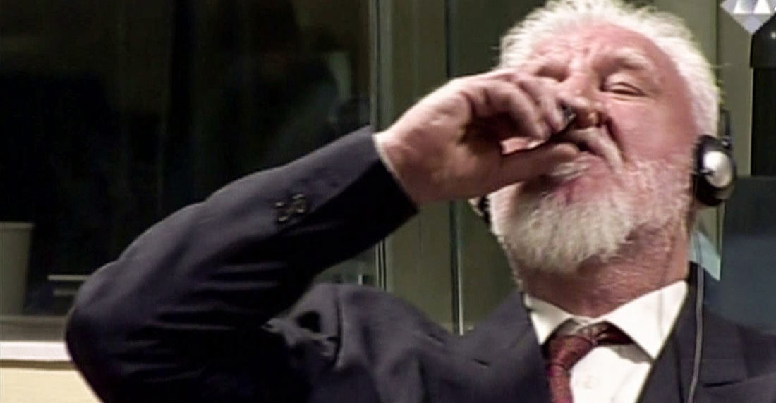 Slobodan Praljak, de 72 años, oyó cómo el tribunal confirmaba su condena a 20 años de cárcel, antes de decir: «Rechazo su veredicto», de sacar un frasco y beber su contenido antes de que su abogado indicara que se trataba de veneno. Varios medios croatas anunciaron su muerte, entre ellos el canal privado N1 y los principales diarios Jutarnji List y Vecernji List. Hina confirmó su fallecimiento, citando a una fuente cercana al condenado.