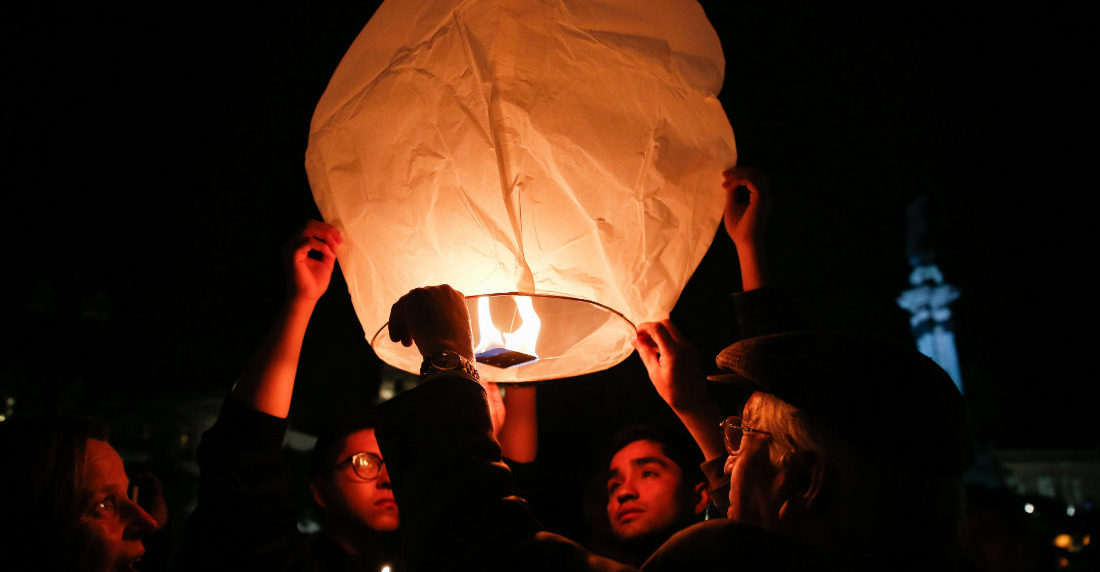 Decenas de globos de papel se elevaron en el cielo de Quito durante una vigilia en homenaje al equipo de periodistas del diario El Comercio, secuestrado y posteriormente asesinado en una zona cercana a la frontera de Ecuador y Colombia.