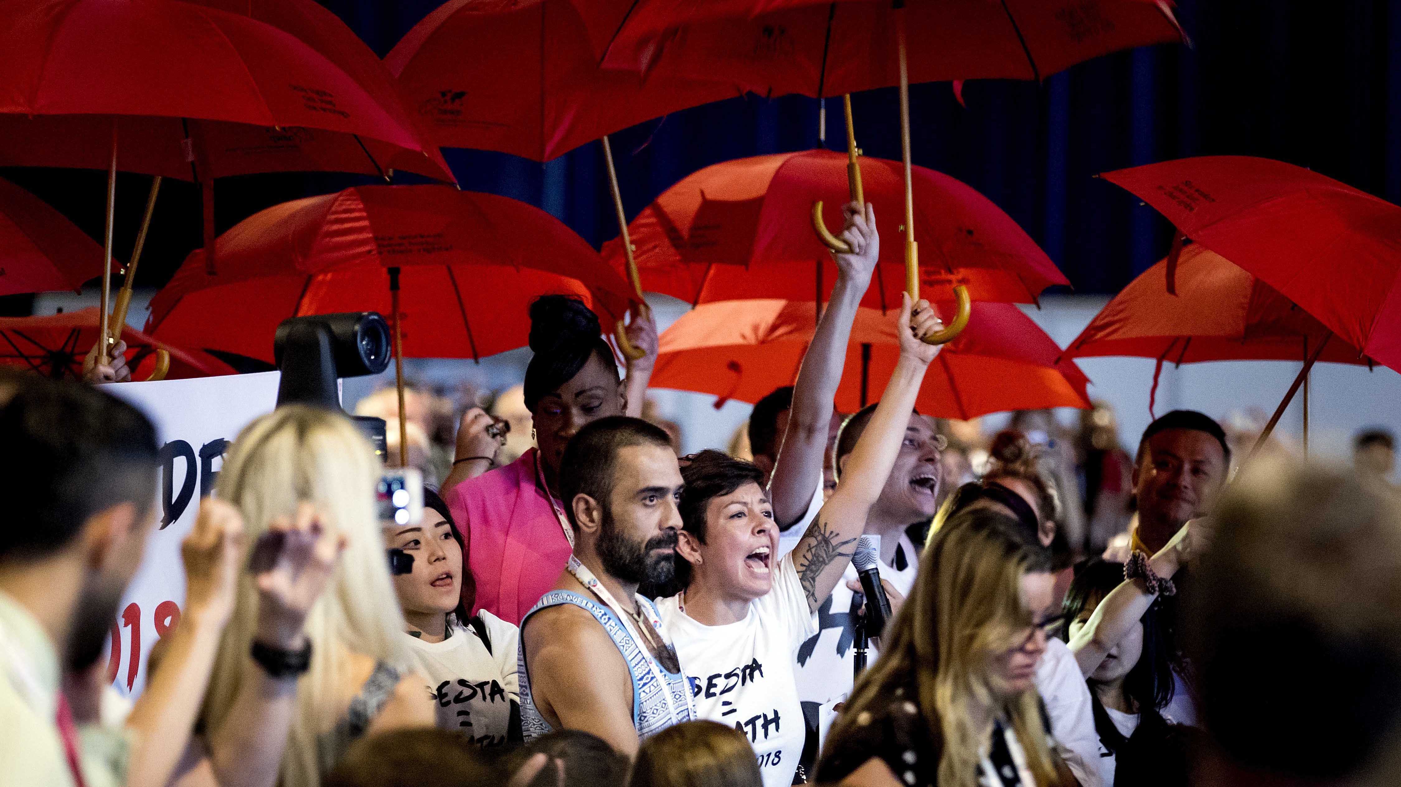 «Ya sabemos que no todos estamos de acuerdo con una o quizás dos cosas que está haciendo la actual Administración estadounidense», dijo Clinton, antes de que el grupo irrumpiera en el salón de conferencias bajo paraguas rojos para denunciar los estigmas y la criminalización que sufren las prostitutas en todo el mundo.