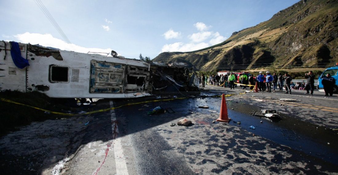 El autobús de matrícula colombiana chocó el martes con otro vehículo en la vía Pifo-Papallacta, unos 30 kilómetros al este de Quito, antes de estrellarse contra unas viviendas.