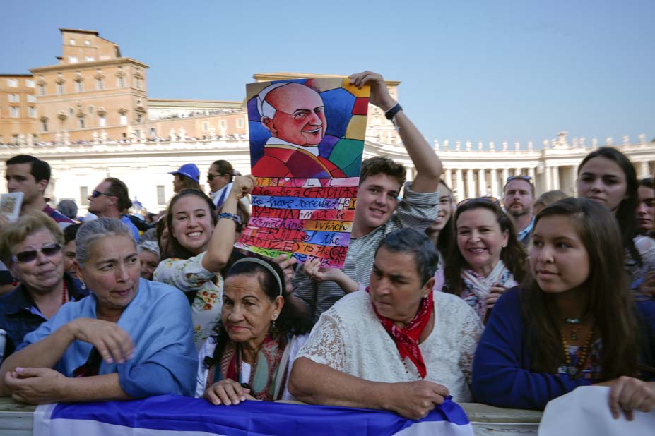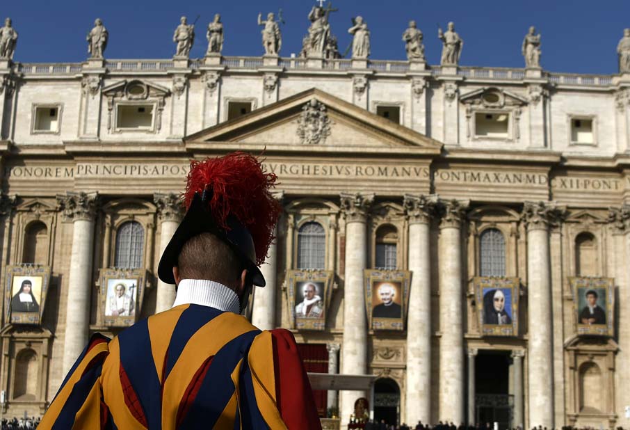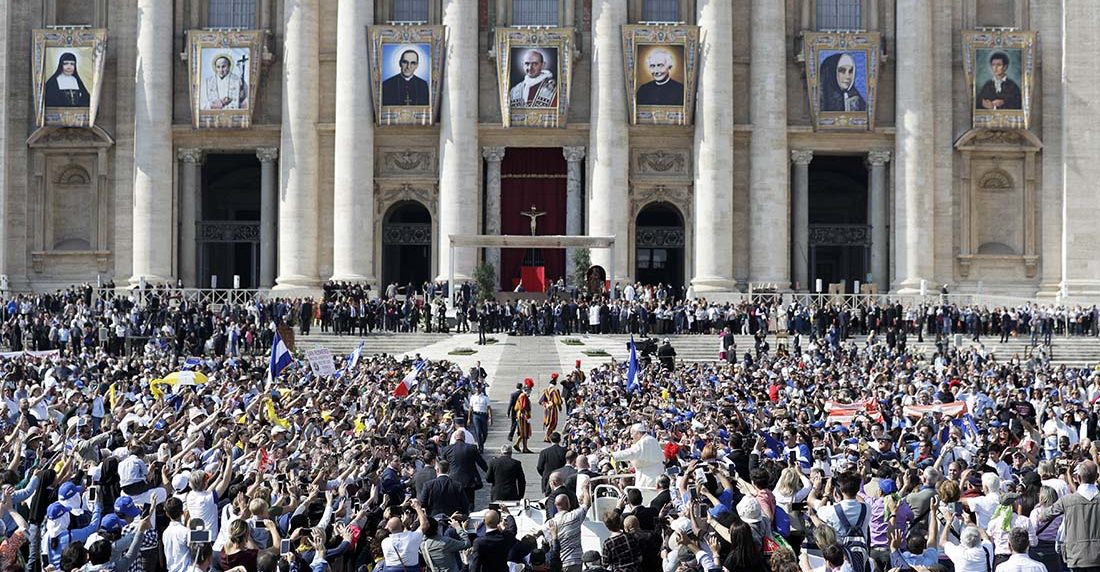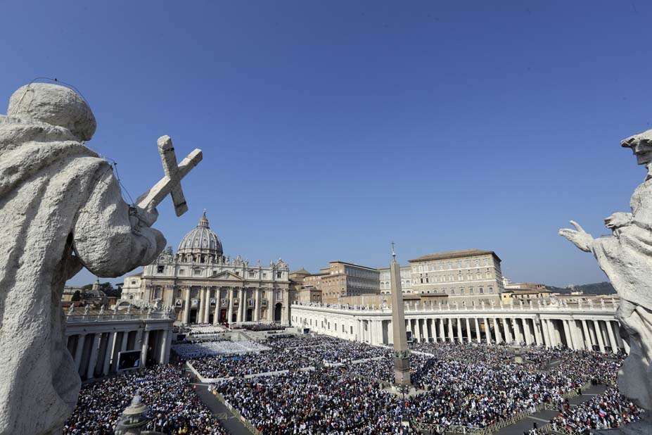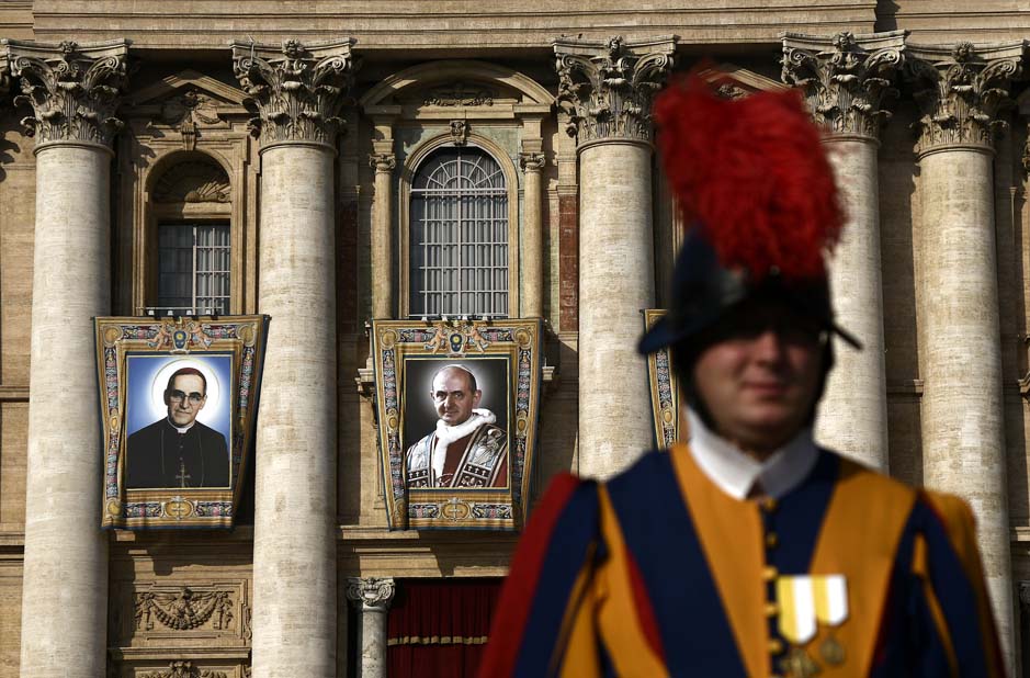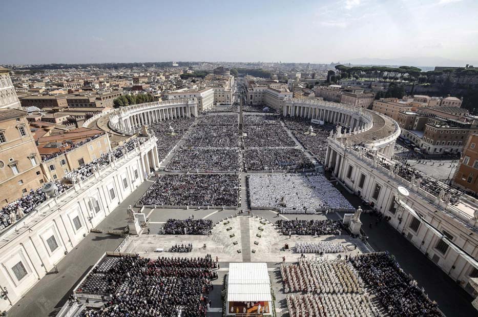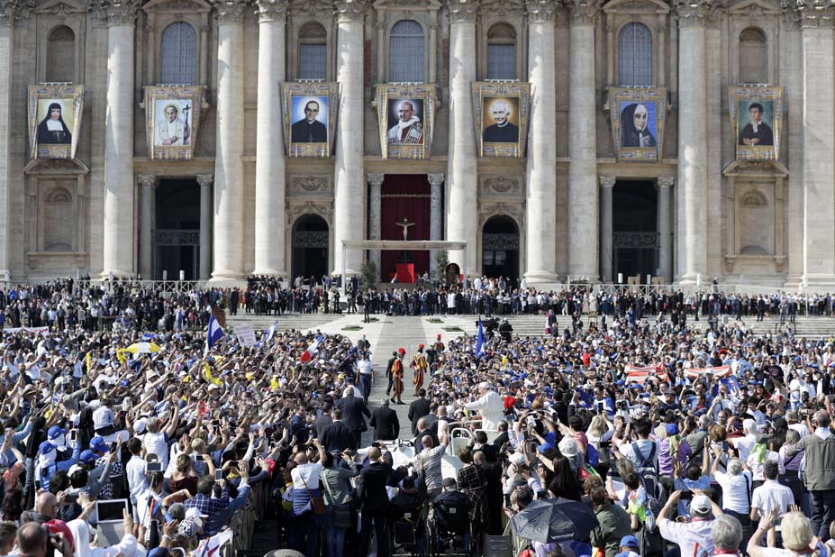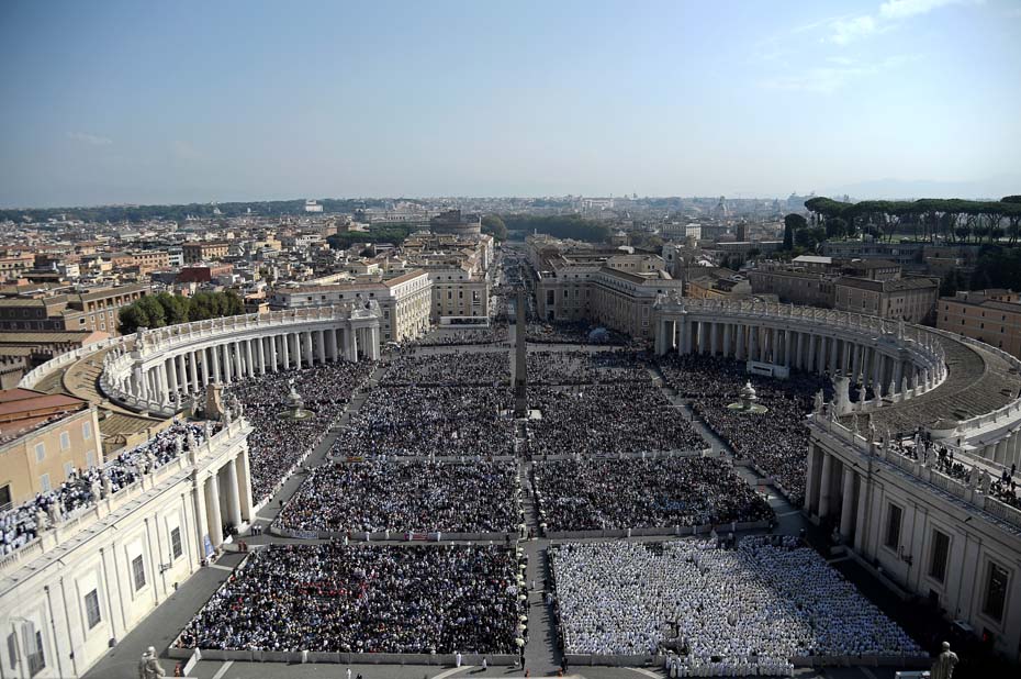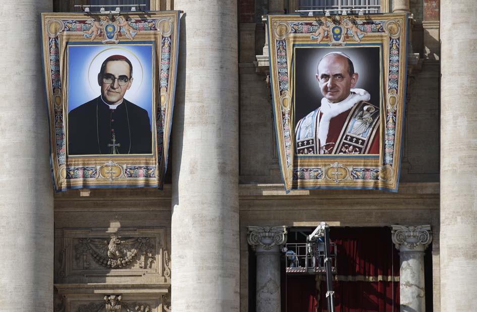Ante cerca 70.000 personas, con el telón de fondo de la basílica de San Pedro en la que se habían colgado los tapices de los siete santos proclamados hoy, Francisco celebró la canonización del que es ya San Romero de América y de Giovani Battista Monti, el papa que clausuró el Concilio Vaticano II.