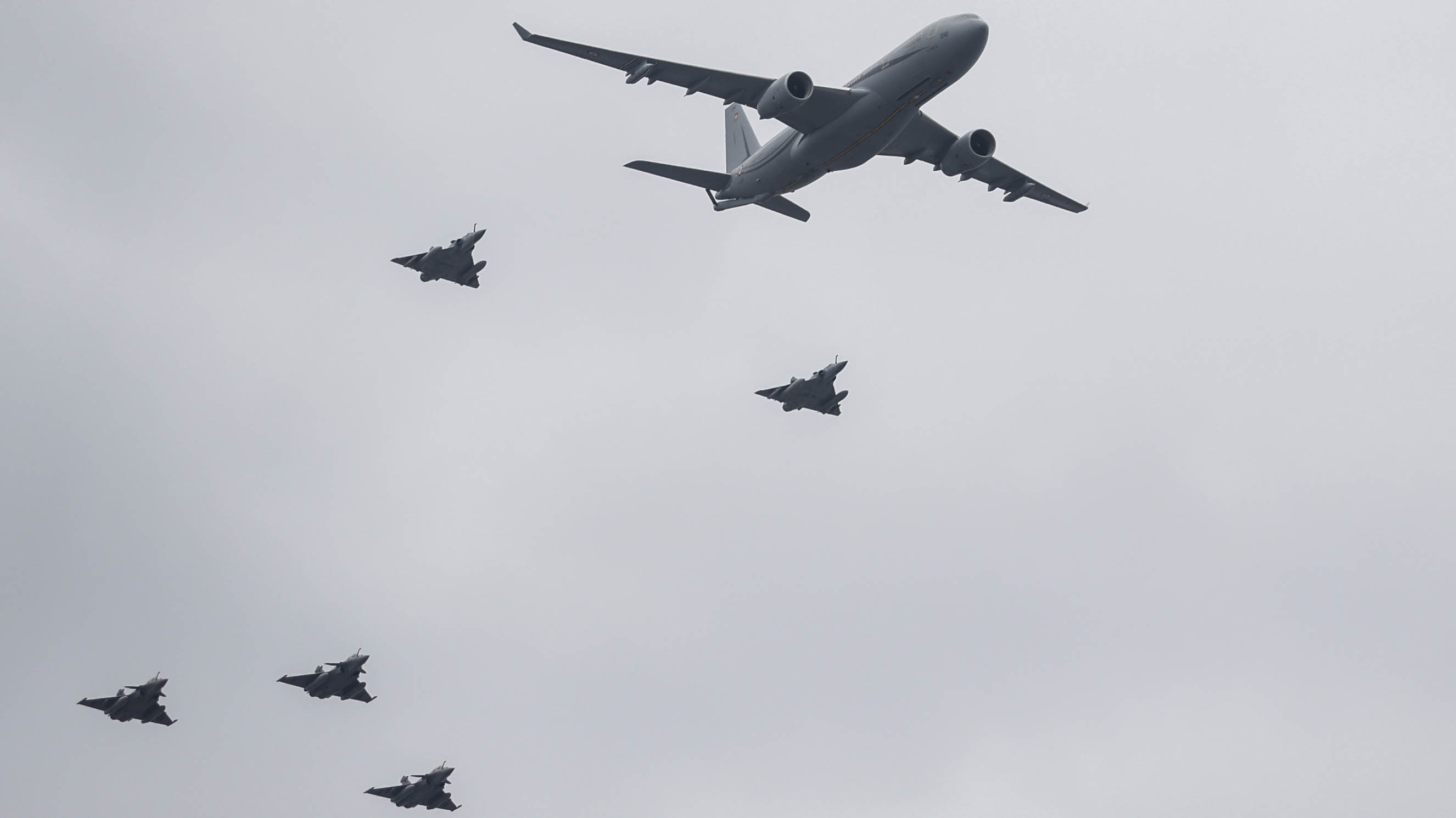 El desfile aéreo incluye un avión de transporte A400M alemán y un C130 español. También participan dos helicópteros Chinook británicos.