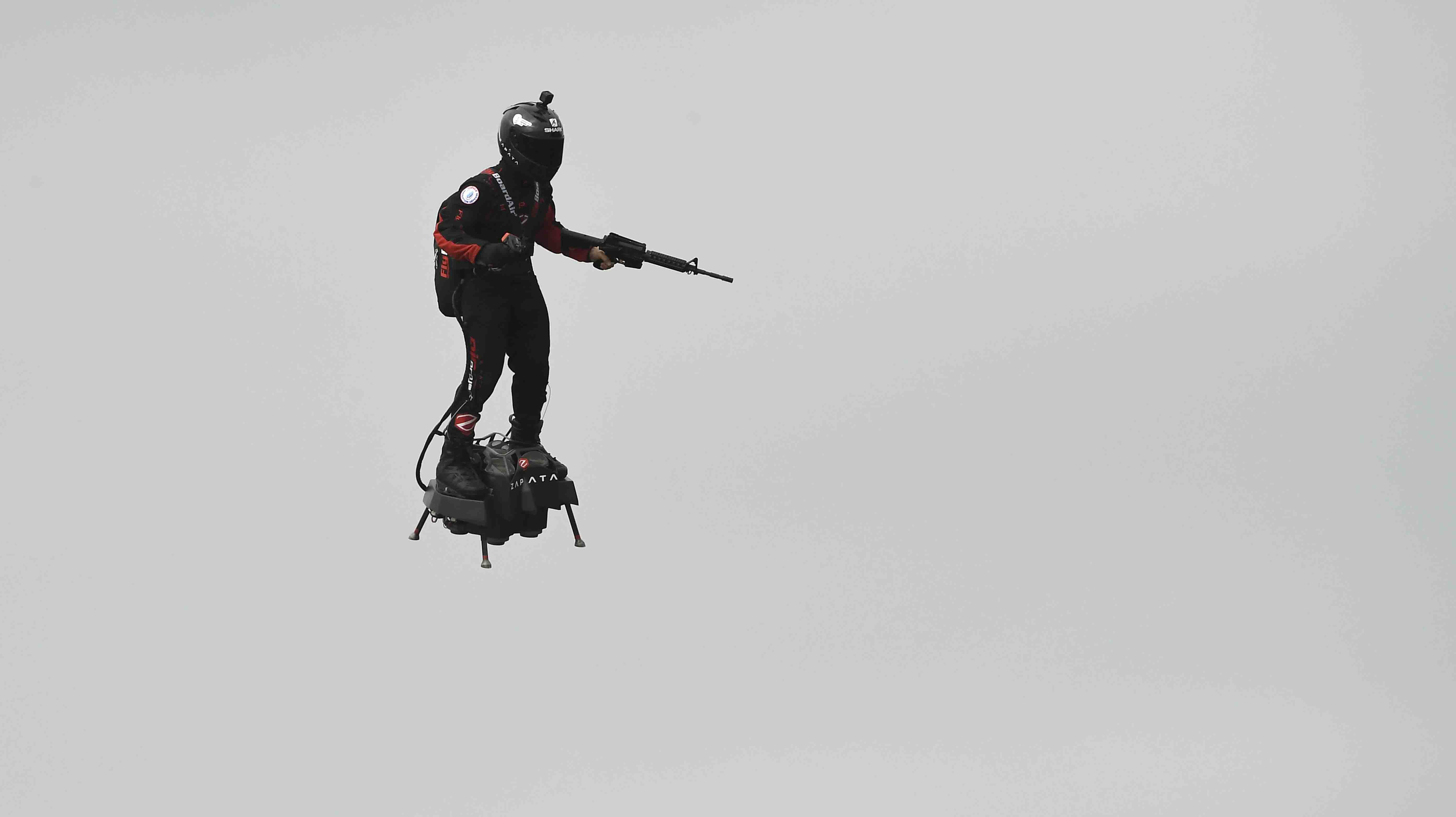 En la apertura del desfile, en la plaza de la Concordia, se exhibieron robots y drones que utilizan las fuerzas armadas, mientras que el plato fuerte del acto consistió en una demostración futurista de Flyboard Air, una plataforma que permite planear con cinco turboreactores, inventada por el francés Franky Zapata, que pilotó su aparato a varias decenas de metros del suelo.