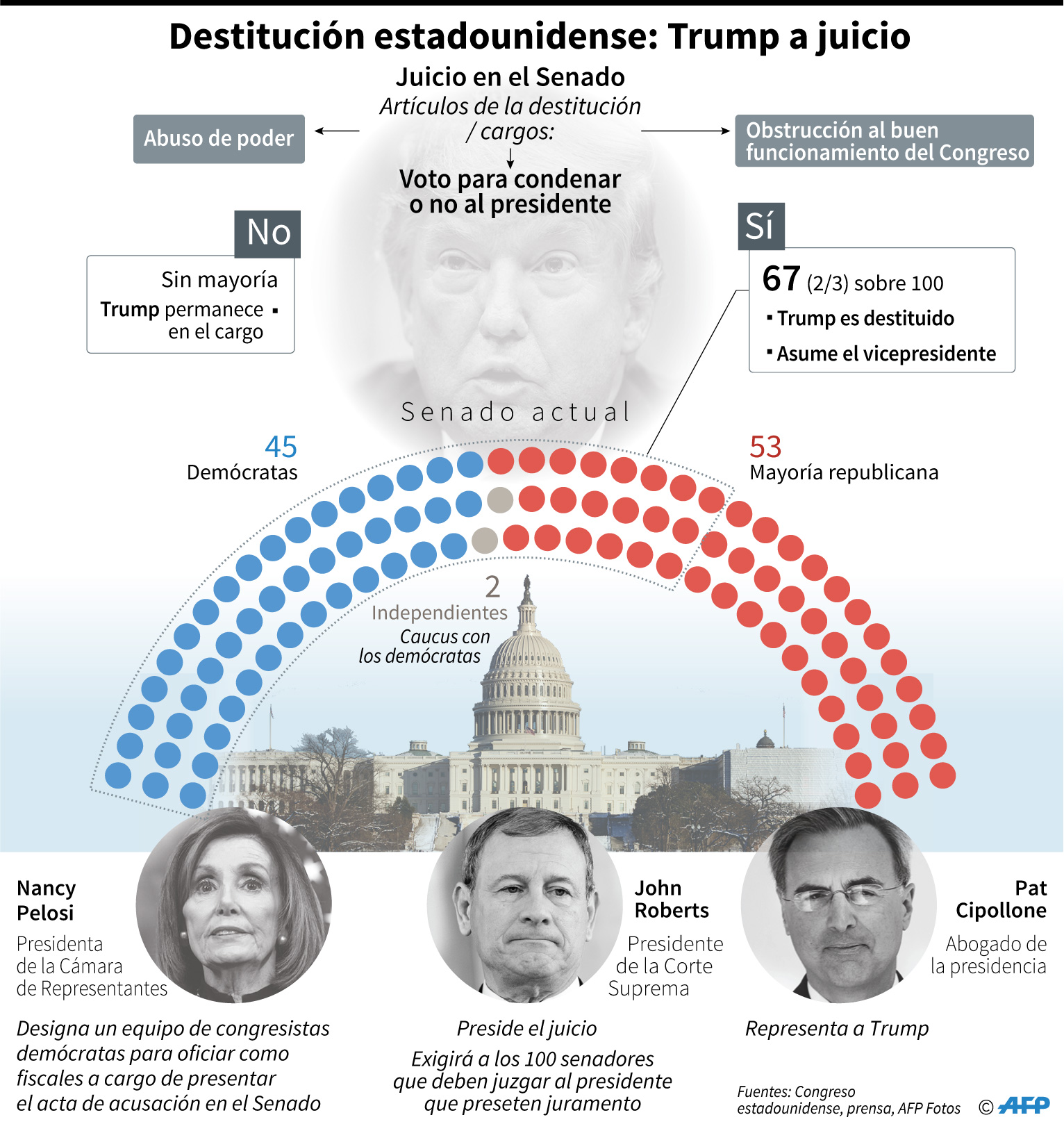 Si se logra la mayoría de los votos, algo que parece improbable pues los republicanos dominan la Cámara, Trump podría ser separado de su cargo. Los republicanos en la cámara son 53 mientras que la bancada demócrata tiene 47 miembros.