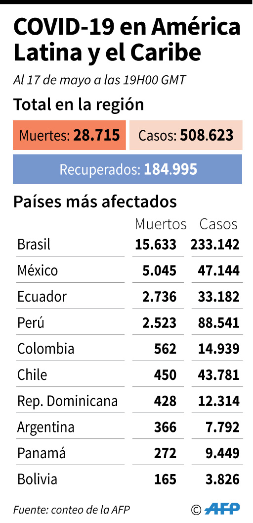 Entretanto, en América Latina, Brasil superó la barrera de los 15.000 muertos, aunque los expertos consideran que las estadísticas esconden una realidad mucho más trágica mientras el presidente Jair Bolsonaro no para de criticar el confinamiento decretado por algunos gobernadores.