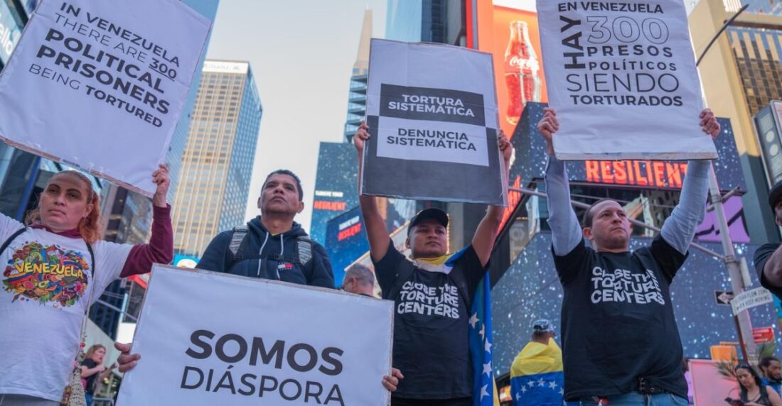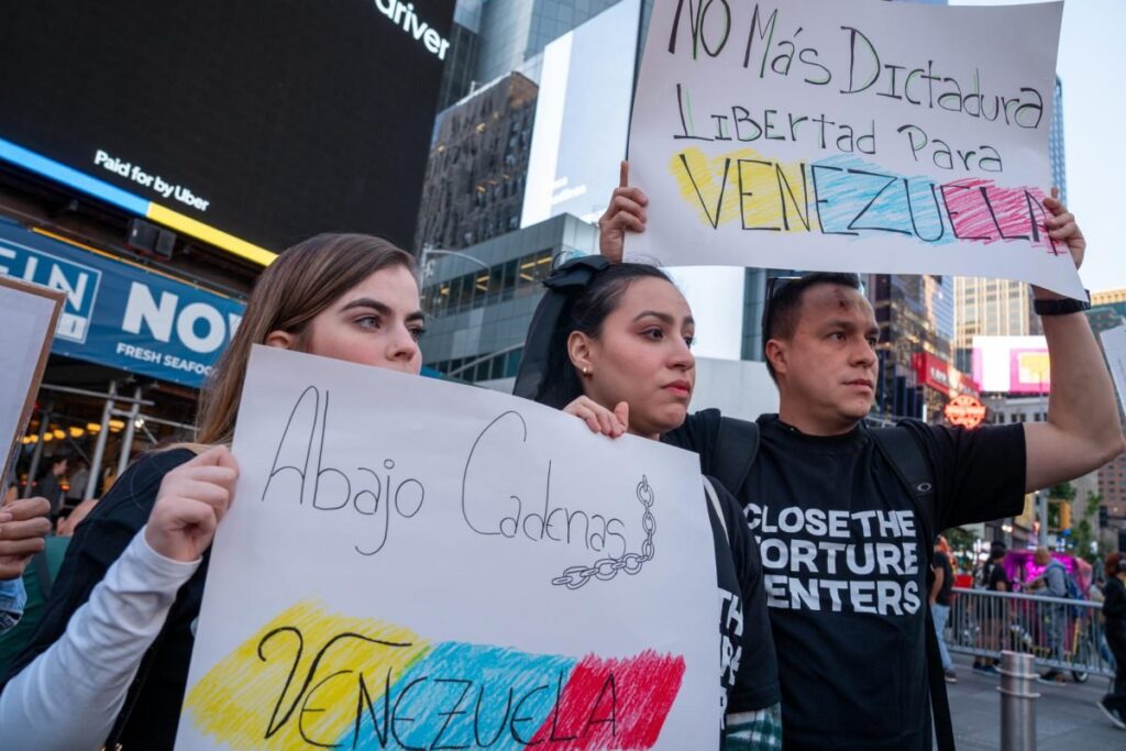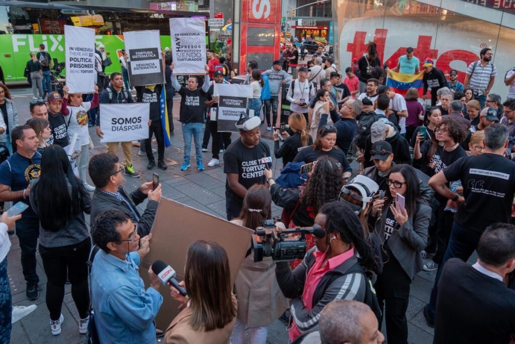 Bajo el resplandor de las pantallas de la 1570 Broadway, la comunidad latina y la diáspora venezolana se unieron para visibilizar las impactantes denuncias de las víctimas que han sufrido torturas y tratos crueles desde 2014 a manos del régimen de Nicolás Maduro. Algunos mensajes decían: «Close El Helicoide» y «Freedom for all political prisoners«.