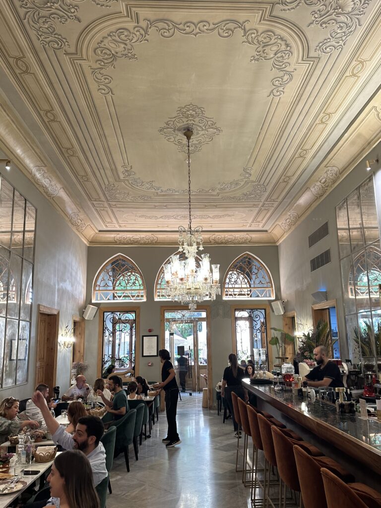Sobre la mueblería moderna y los arcos de estilo árabe de Beit Kanz, un restaurante en Beirut, se alzan enormes candelabros de cristal que cuelgan de amplísimos techos pintados hace dos siglos por artesanos italianos: motivos neoclásicos de múltiples formas y patrones, en verdes brillantes o pasteles aristocráticos. El sitio entero, con sillas de mimbre al aire libre bajo árboles de mandarinas y jaulas con pinzones cebra, evoca el espíritu levantino de aquella ciudad híbrida que es Beirut.