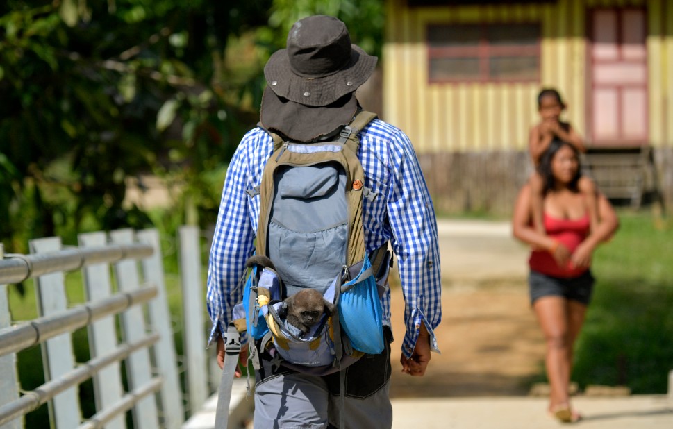 Jhon Jairo Vásquez, director de la Fundación Maikuchiga, lleva en su espalda en un morral un mono rescatado de los cazadores. (Foto: Raúl Arboleda/AFP)