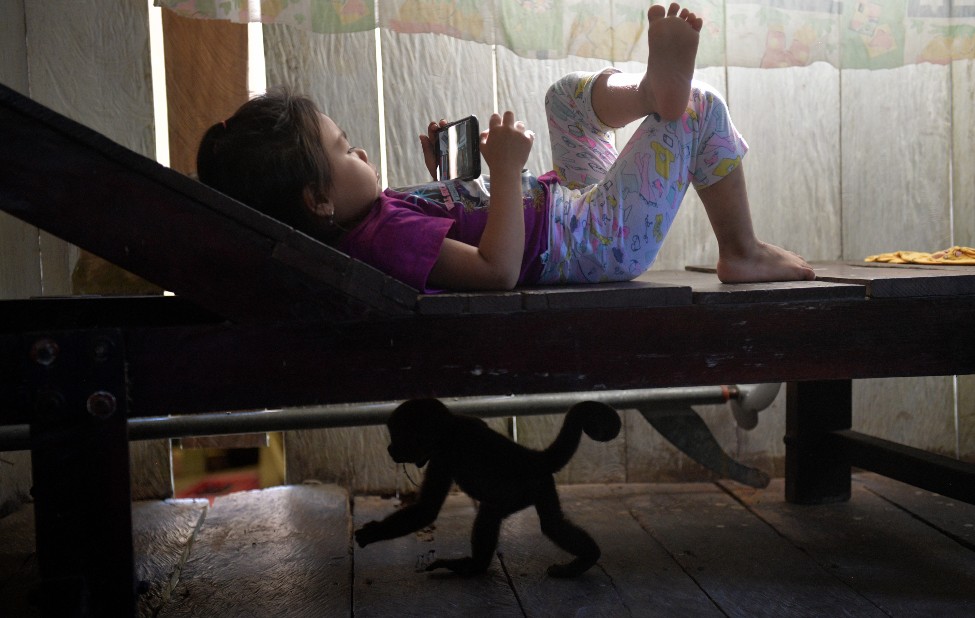 Un bebé de mono Humboldt, mono choyo, mono barrigudo o mono lanudo gris, en inglés Wooly (Lagothrix lagotricha) acompaña a una niña distraída mirando un teléfono celular en la Fundación Maikuchiga, en la comunidad indígena de Mocagua, cerca de Leticia, Colombia, en noviembre de 2020. Fotos: Raúl ARBOLEDA / AFP