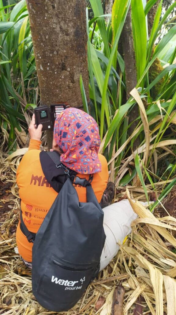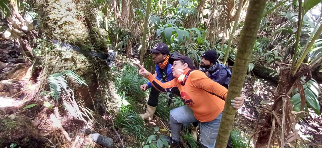 Equipo revisando una de las cámaras trampa durante el recorrido. Foto: Fundación Guarenas Repano
