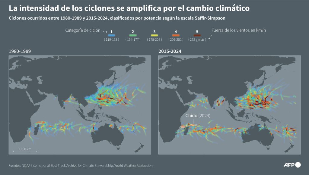 El ciclón Chido, que asoló Mayotte y Mozambique en diciembre, hubiera sido menos potente sin los efectos del cambio climático, según un estudio preliminar.