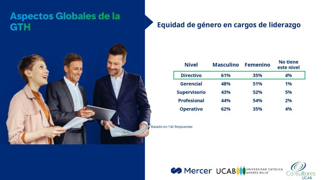 Según un estudio sobre las Tendencias de Gestión de Talento 2023, realizado por la Universidad Católica Andrés Bello (UCAB) y la consultora Mercer Venezuela, solo el 35% de las mujeres ocupan cargos directivos, mientras que los hombres superan el 60%.