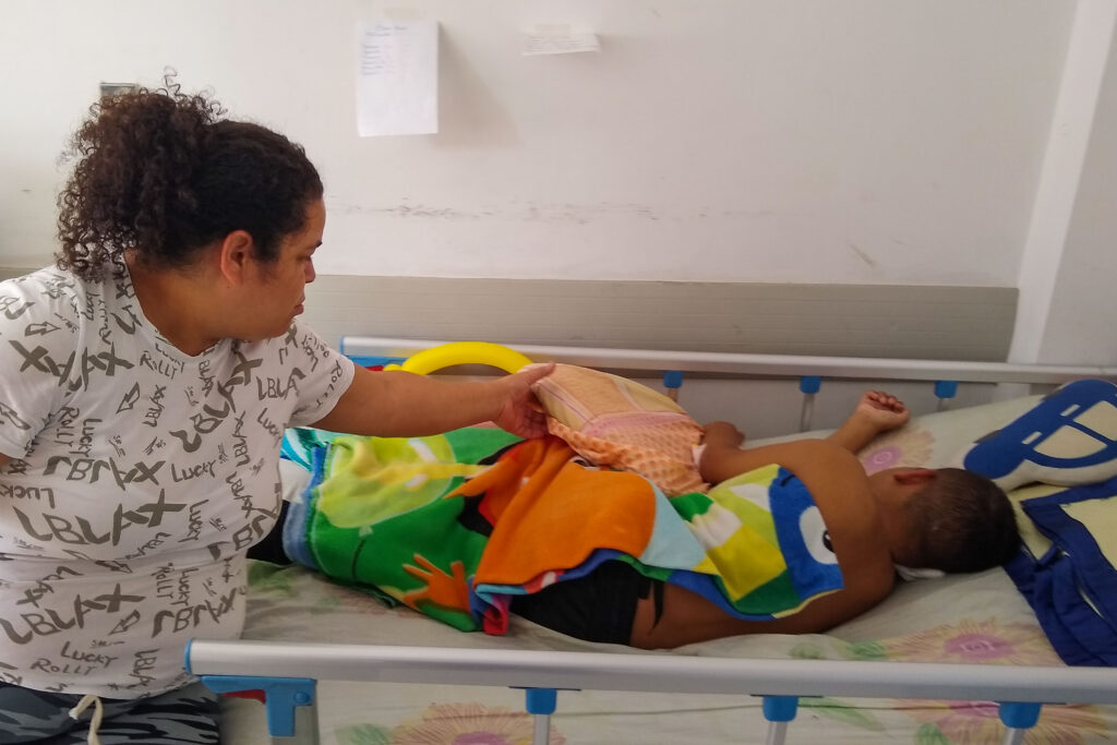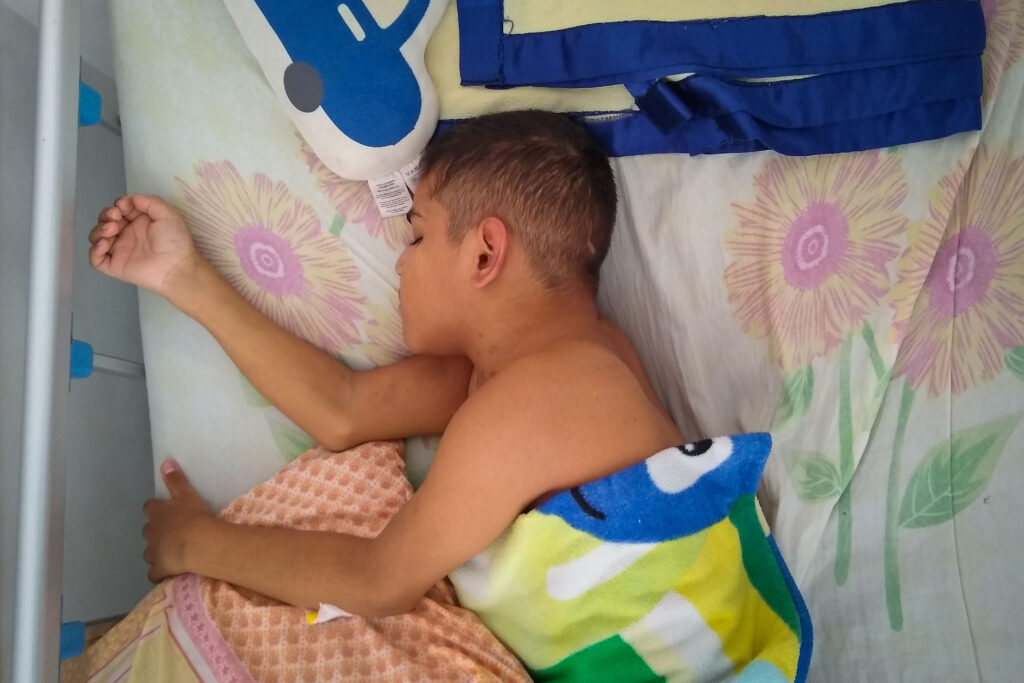 A diferencia de otros pacientes que visitado, mi encuentro con Jheison fue a medias porque dormía. La que habló fue su acompañante y protectora, Diana, quien me contó su realidad: es madre soltera y se dedica al cuidado de su hijo. El padre del joven ayuda, pero sus ingresos son muy pocos para cubrir todos los gastos médicos, especialmente en Venezuela.