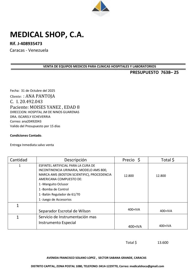 La meta es reunir los 13.600 dólares que cuesta el esfínter artificial de Medical Shop C.A., el proveedor médico que los vende en Venezuela.