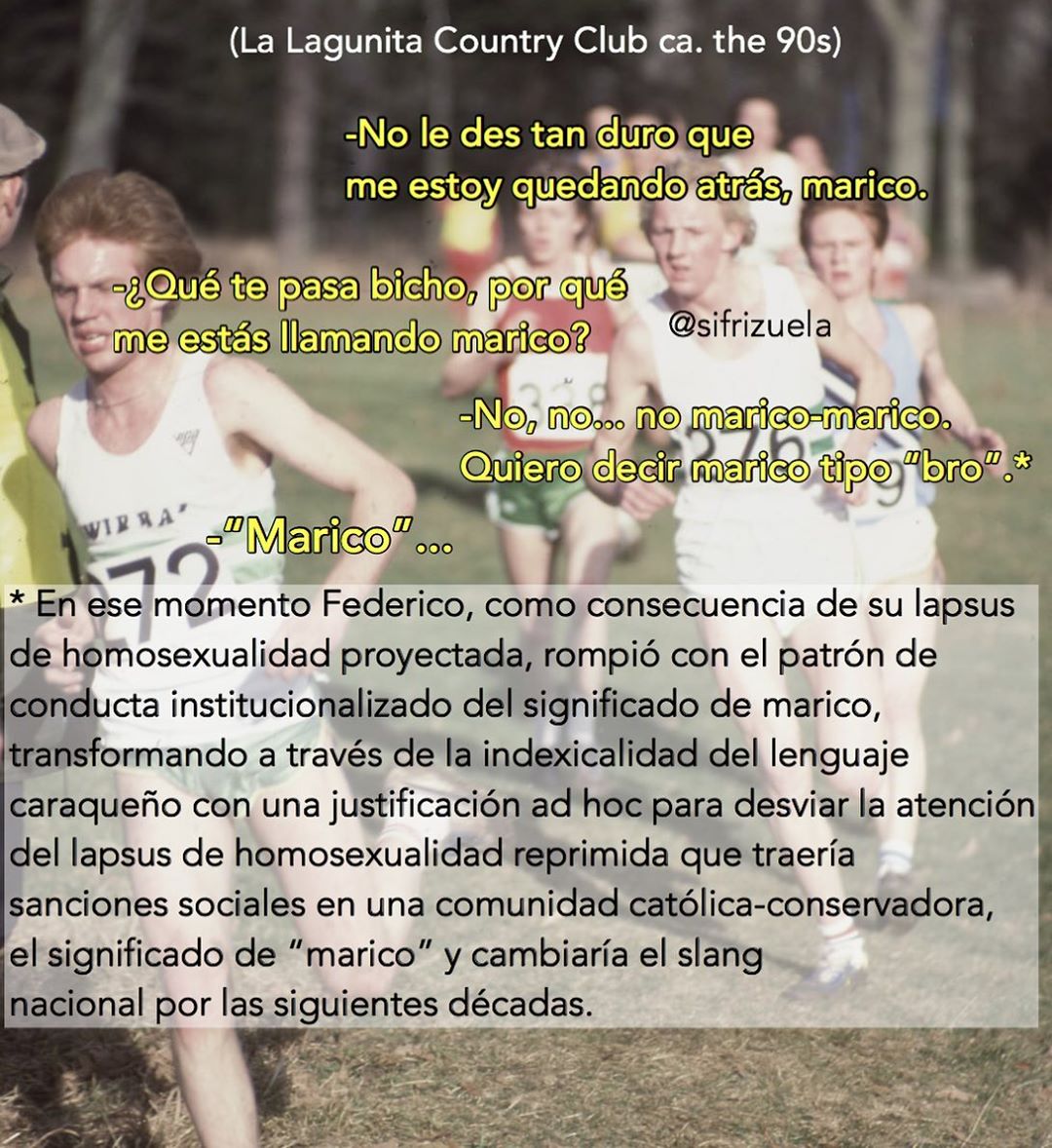 Pasé unos meses tratando de averiguar sin éxito quién manejaba todo aquello, hasta que una amiga con vínculos sifrinos me dio el dato. Sorpresa: @sifrizuela era una persona a quien conozco, admiro y quiero mucho. De inmediato, cuando le dije que me había enterado, negó la información, pero a los días, en un gesto de condescendencia, publicó en sus stories una foto mía con Bárbara Palacios en Nueva York, aunque yo, me aclaró luego, no soy sifrino puesto que estudié en el Cristo Rey de Santa Mónica y no en el Jefferson o en el Cumbres, lo cual me invalida de plano… ¡con lo que me gusta a mí un sifrino! En fin, que me sigo riendo con sus publicaciones, y estoy esperando que @sifrizuela me brinde de vuelta un café como el que yo le brindé hace poco en Franca de Las Mercedes. ¡Qué intensidad, lo único que hizo esa mañana fue preguntarme sobre Sofía Imber!